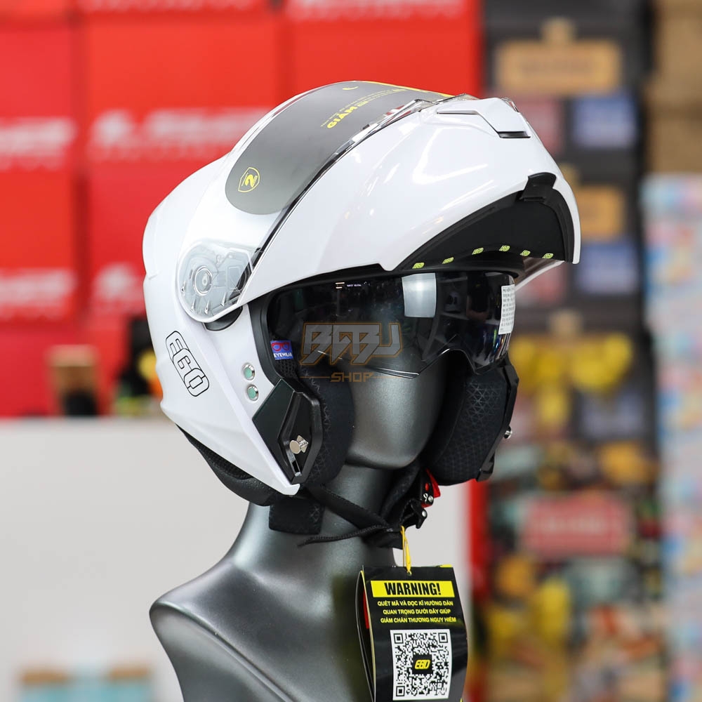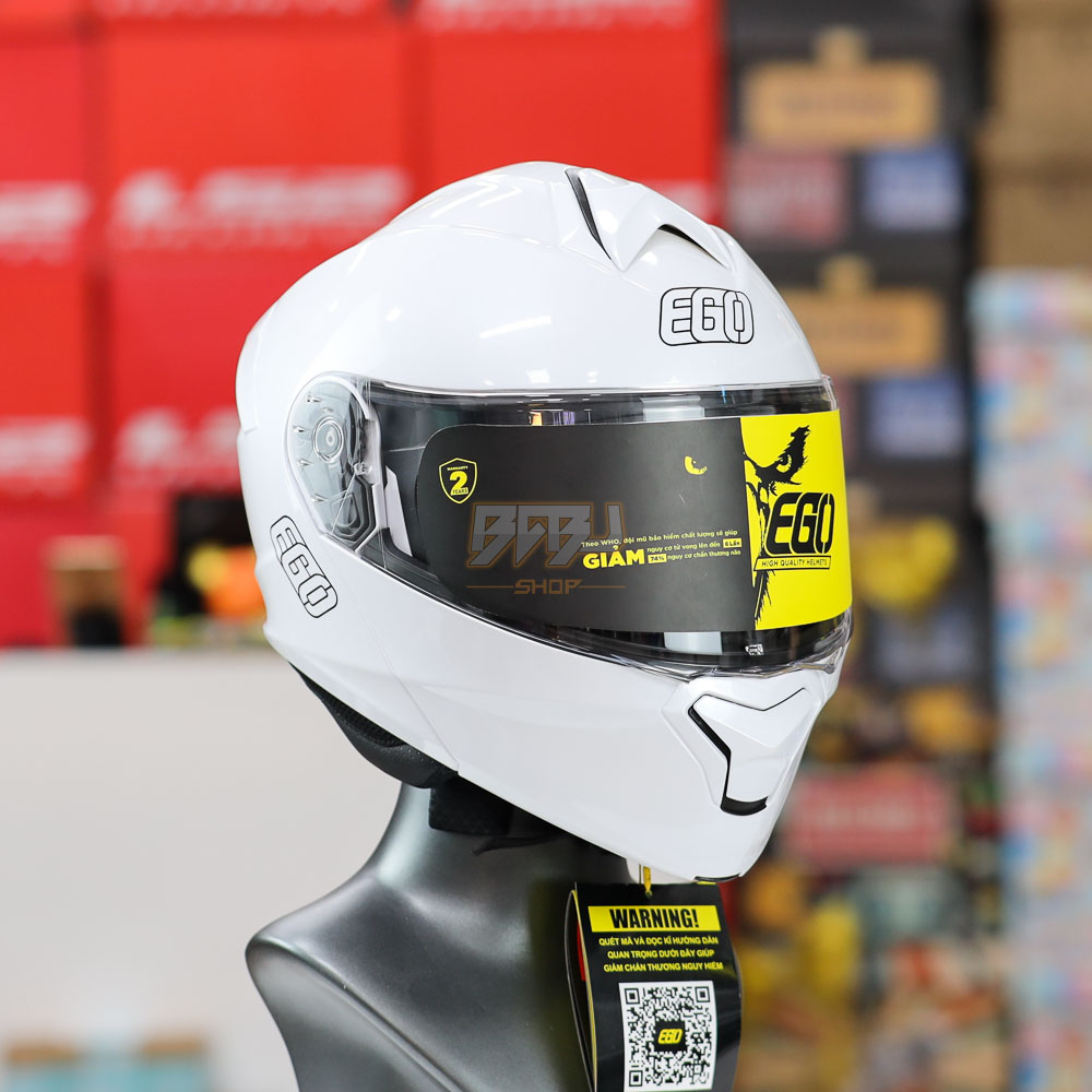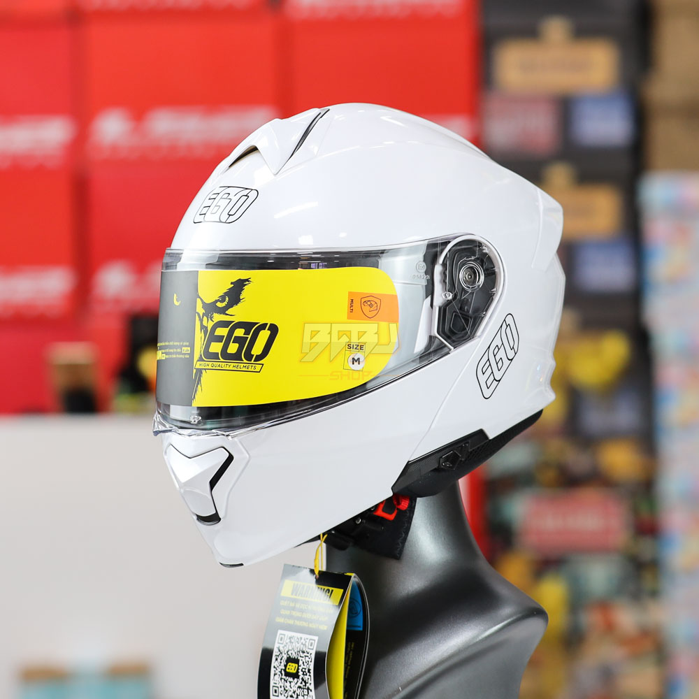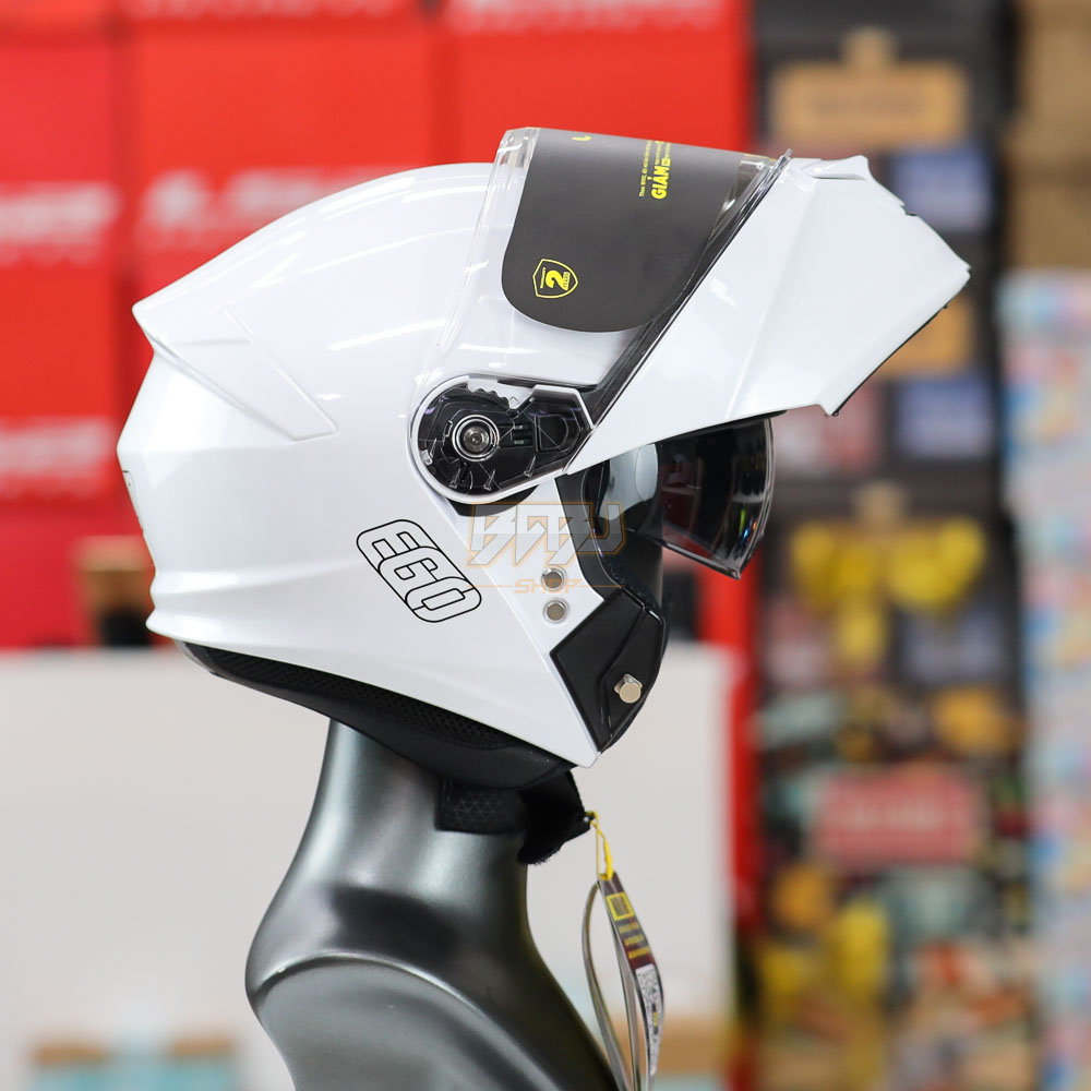 Mũ bảo hiểm lật hàm EGO E91 2 kính trắng bóng – thiết kế hiện đại, trang bị 2 kính tiện dụng, lớp vỏ ABS chắc chắn, đệm lót êm ái, khóa an toàn.