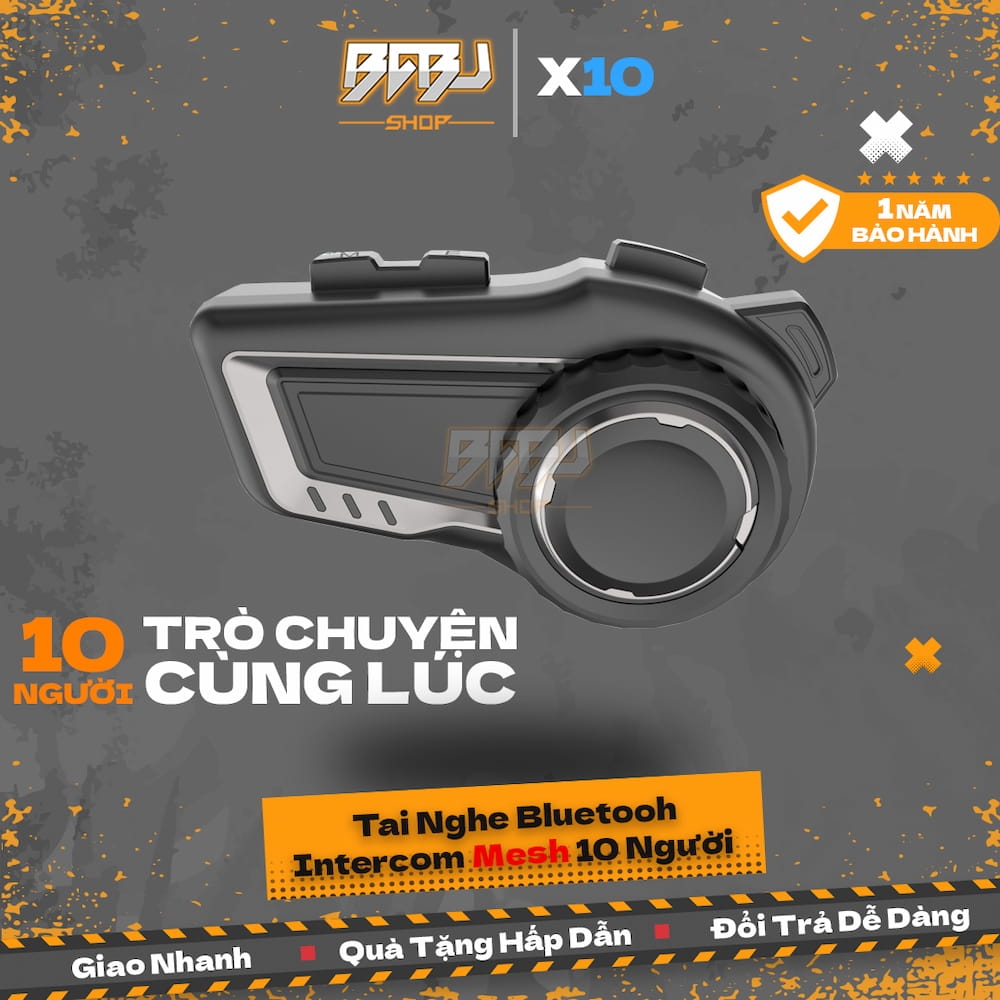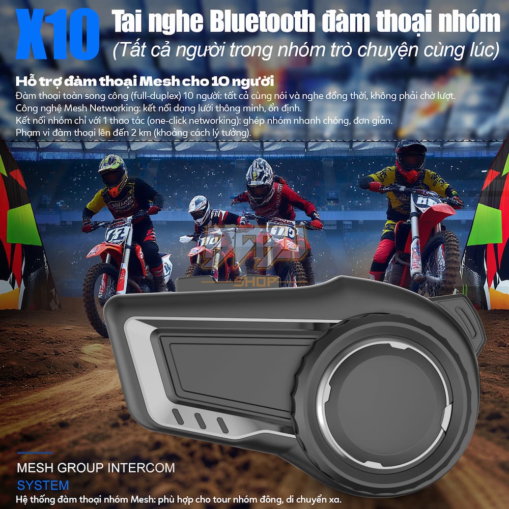 Tai nghe Intercom X10 hỗ trợ kết nối 10 thiết bị cùng lúc, khoảng cách lên đến 1000m. Âm thanh HD pin 10 giờ, chống nước IPX6 – phù hợp cho biker, phượt thủ, giao hàng.